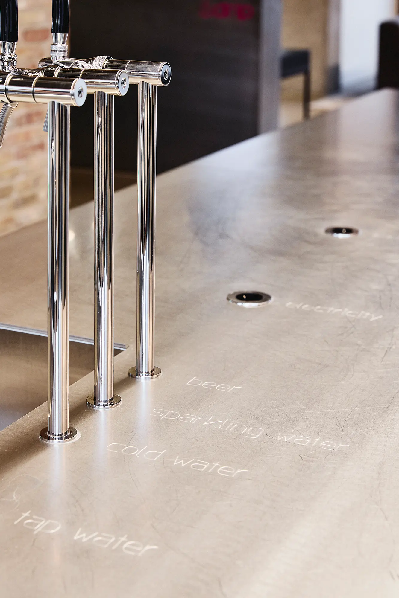 Fronten af lokalet blev indrettet med en særlig fleksibilitet i tankerne. Rummet kan hurtigt transformeres, så det både kan danne ramme om fredagsbarer, foredrag, kantinefunktioner eller sociale arrangementer. Dette gør det muligt for kontoret at tilpasse sig skiftende behov og begivenheder – en essentiel kvalitet for en virksomhed i vækst.