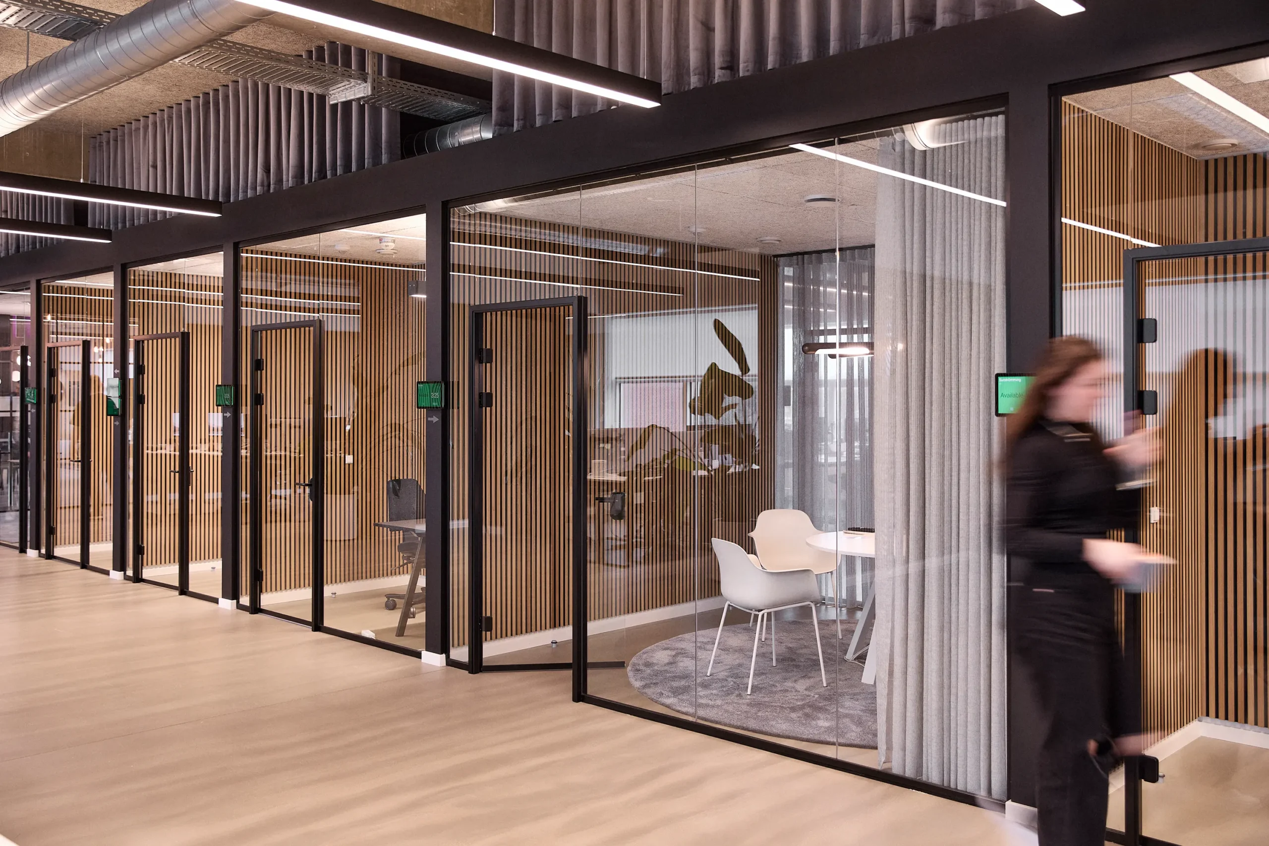 I hjertet af lokalet designede vi en central kerne i glas og akustiske paneler. Denne kerne blev tænkt som kontorets nervecenter og favner flere funktioner: private 1:1 møderum, et stort mødelokale, et mellemstort rum samt flere enkeltmandskontorer – skabt som moderne “mutebokse” med ergonomiske arbejdsstole og fuldt udstyrede skriveborde. Her blev der lagt vægt på ro, koncentration og fleksibilitet for medarbejderne.