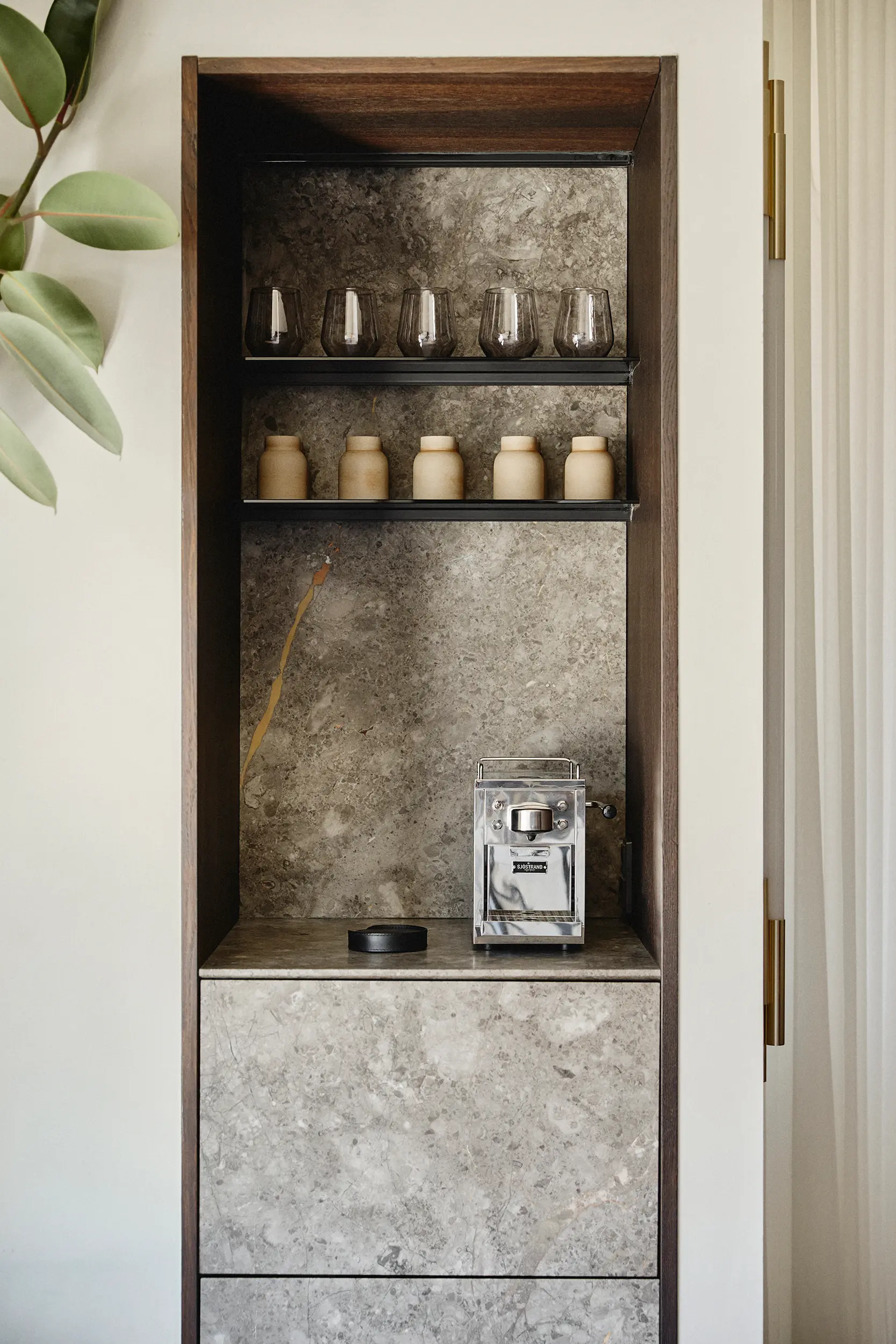 Den stenbeklædte bordflade og bagvæg skaber en helstøbt materialitet, hvor niche, opbevaring og funktion smelter sammen i én samlet komposition. Resultatet er en elegant kaffestation, der opleves som en naturlig forlængelse af rummets arkitektur.